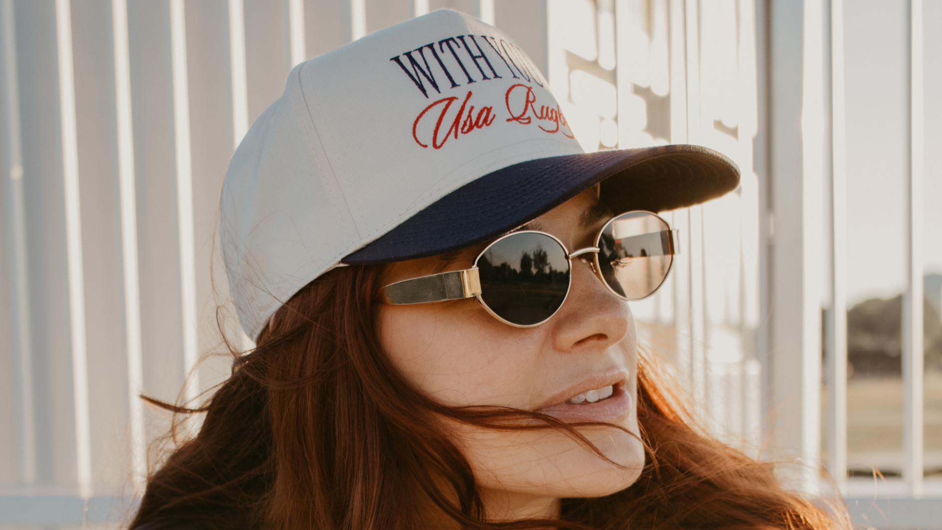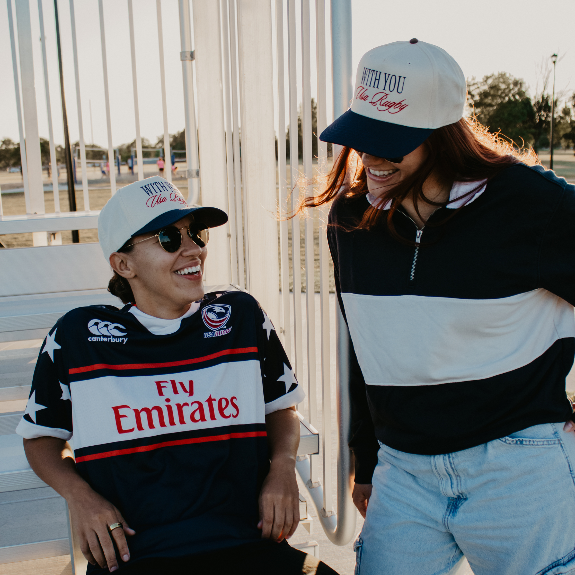 The With You Usa Rugby Hat is a nod to team pride, wrapped in vintage sideline style. This structured five-panel cap features bold embroidery on a cream crown with a navy brim, designed to wear well from match day to everyday.